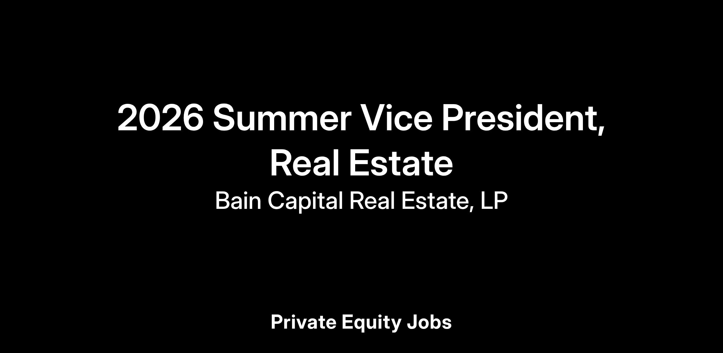 The Summer VP role is a 10-week Boston-based opportunity. The Real Estate Summer VP is uniquely positioned to join a small and passionate investment team and play an active role in every aspect of the business. This role includes partnering with experienced private equity and real estate investment professionals to drive financial value throughout our investment processes and ownership periods. The Summer Vice President experience will be characterized by significant deal responsibilities, broad exposure to all aspects of the real estate transaction process, and substantial direct interaction with senior investment partners and Joint Venture executives. He/she will play a key role in evaluating investment opportunities, helping to drive our investment decision process, and working with our assets to drive value creation. The Summer VP will learn how to evaluate investment opportunities through the application of fundamental strategic analysis. Bain Capital professionals are exposed to a broad set of real estate sectors and strategies, and systematically develop skills as a value-added investor—not just a financial engineer.