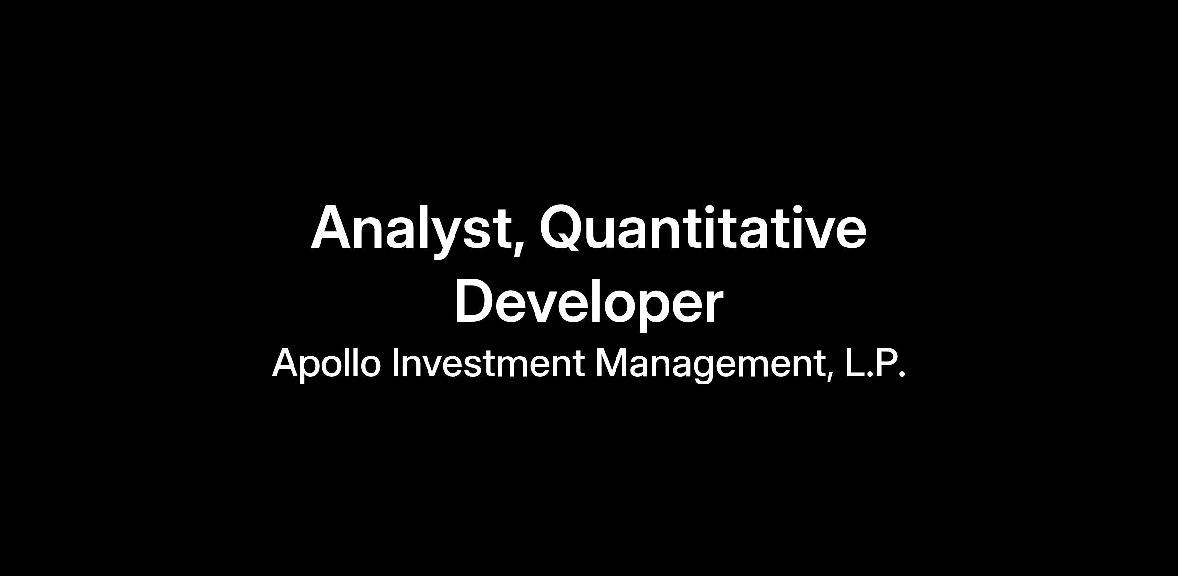 Apollo is seeking a Quantitative Developer to join its Quantitative Analytics Team (the Quant Team) in the Woodland Hills office. The Quant Team develops and maintains proprietary quantitative models that support financial reporting, risk measurement, pricing, and strategic business decisions. The team covers a broad range of asset classes within Asset-Backed Finance (ABF), including residential, commercial, and consumer credit, as well as asset-backed structured products.