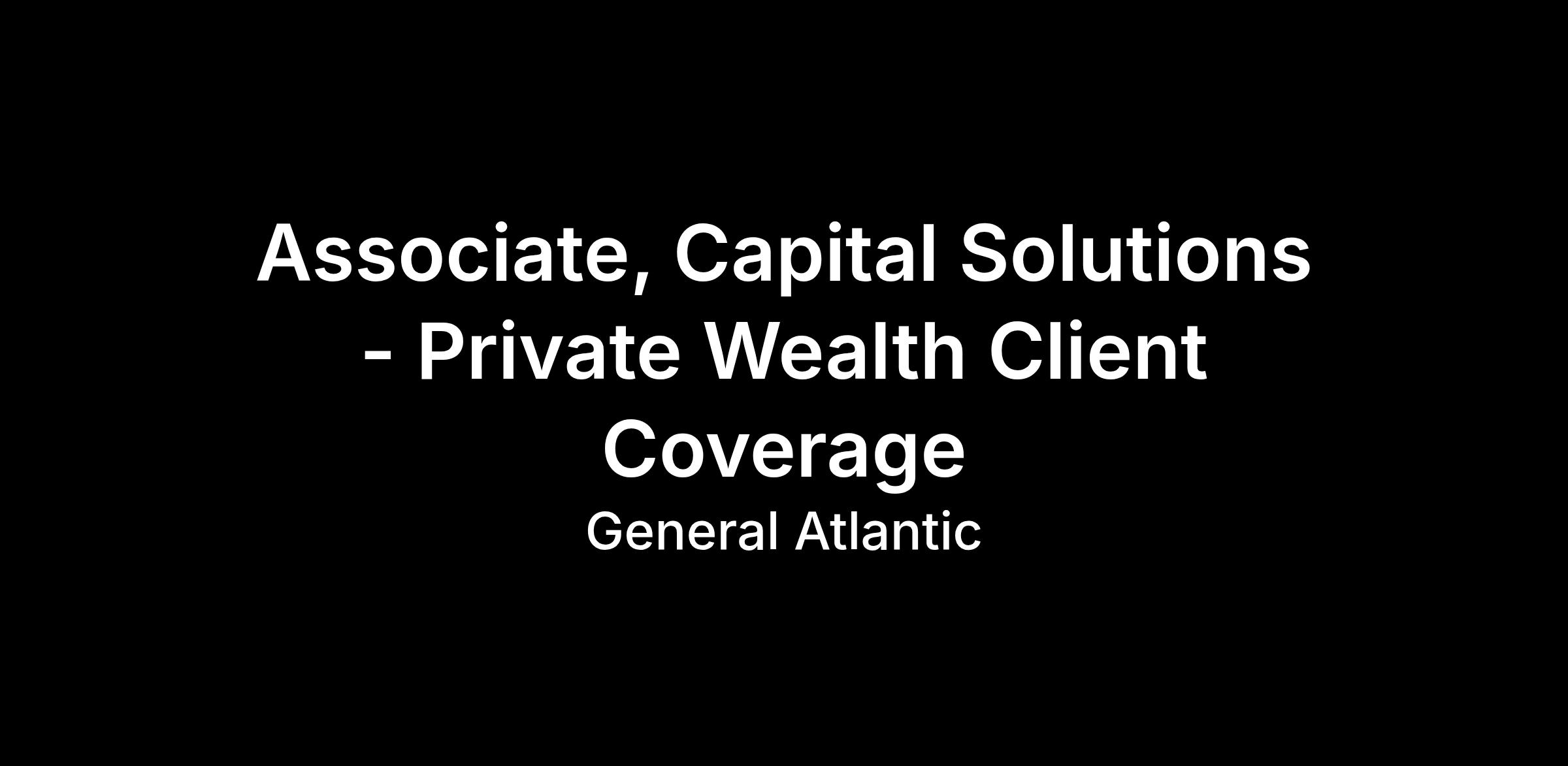 General Atlantic is looking for a high-caliber Associate to join its Private Wealth Capital Solutions team based in New York to support financial advisor client coverage across an assigned U.S. region. The Client Coverage Associate will work in close partnership with regional Client Coverage leads, covering financial advisors across both private bank and wirehouse wealth management platforms, providing proactive sales and client service support to drive fundraising and deepen relationships advisor across General Atlantic’s Growth Equity, Climate, Infrastructure and Credit strategies in their assigned region. The candidate will work closely with senior members of General Atlantic’s global Capital Solutions team, while collaborating with professionals across the firm to design and execute scaled fundraising, financial advisor engagement, and client service initiatives across the private wealth channel.