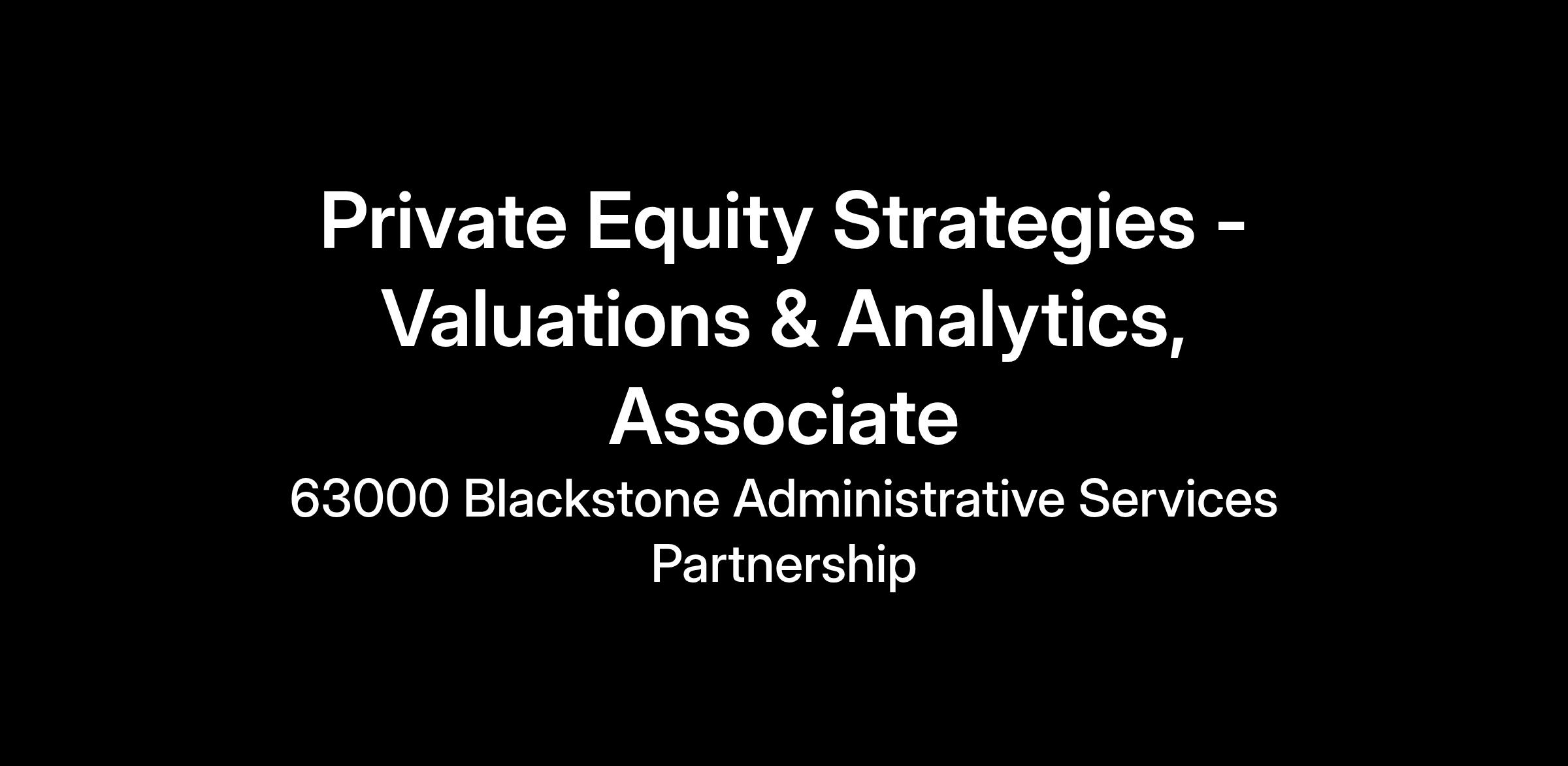 Blackstone’s Portfolio Management - Valuations and Analytics team is looking for an Associate to support Blackstone Private Equity Strategies. The core focus of the group is to prepare, evaluate, analyze, and summarize portfolio investment valuation results. In addition to valuations, the team is called upon to handle a variety of ad hoc and recurring analyses related to portfolio monitoring and reporting.